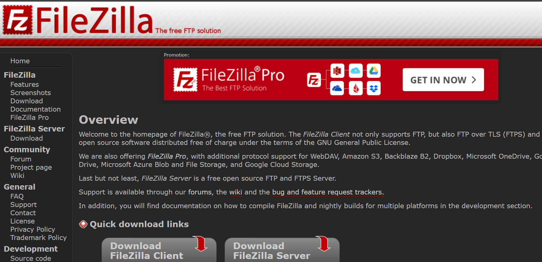 Overview Welcome to the homepage of FileZilla®, the free FTP solution. The FileZilla Client not only supports FTP, but also FTP over TLS (FTPS) and SFTP. It is open source software distributed free of charge under the terms of the GNU General Public Licen