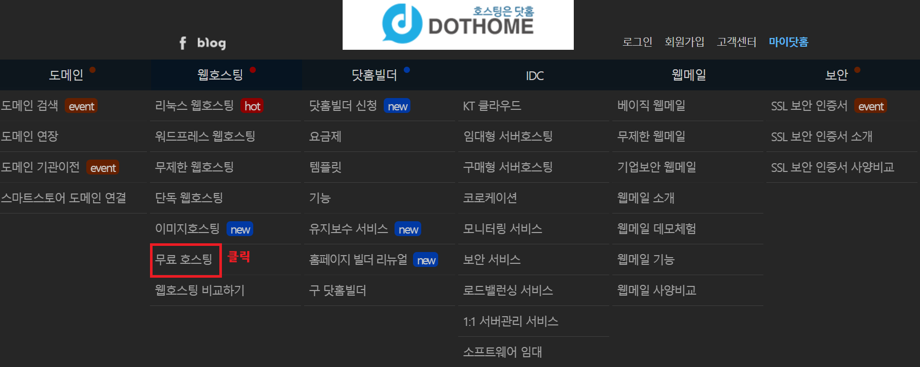 상단 메뉴바 웹호스팅 -> 무료 호스팅 클릭
