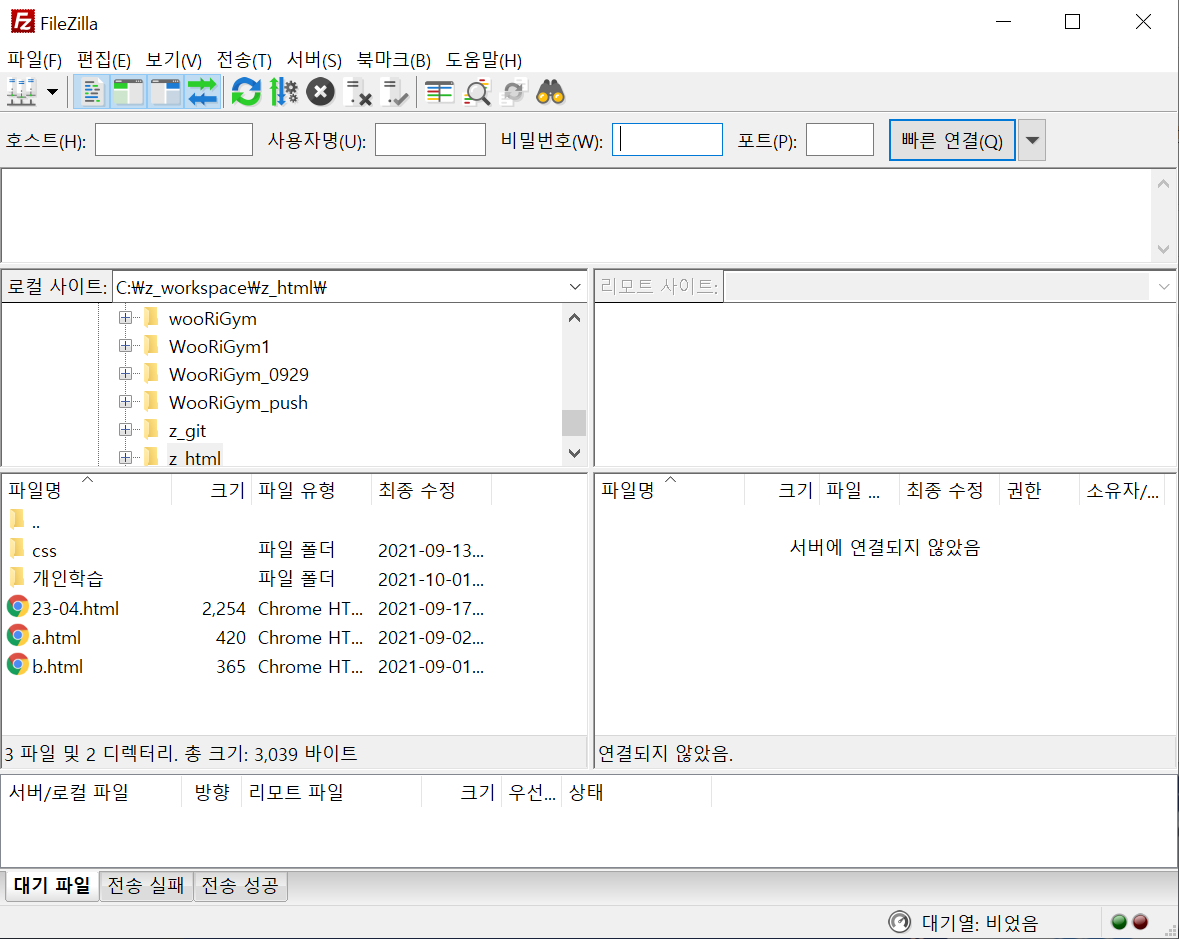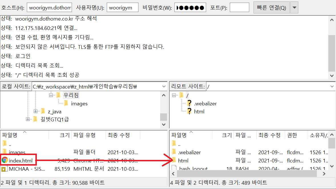 아래는 왼쪽은 내 PC 파일이 보이고, 오늘쪽은 호스팅사이트에 HTML파일을 올리면 된다.