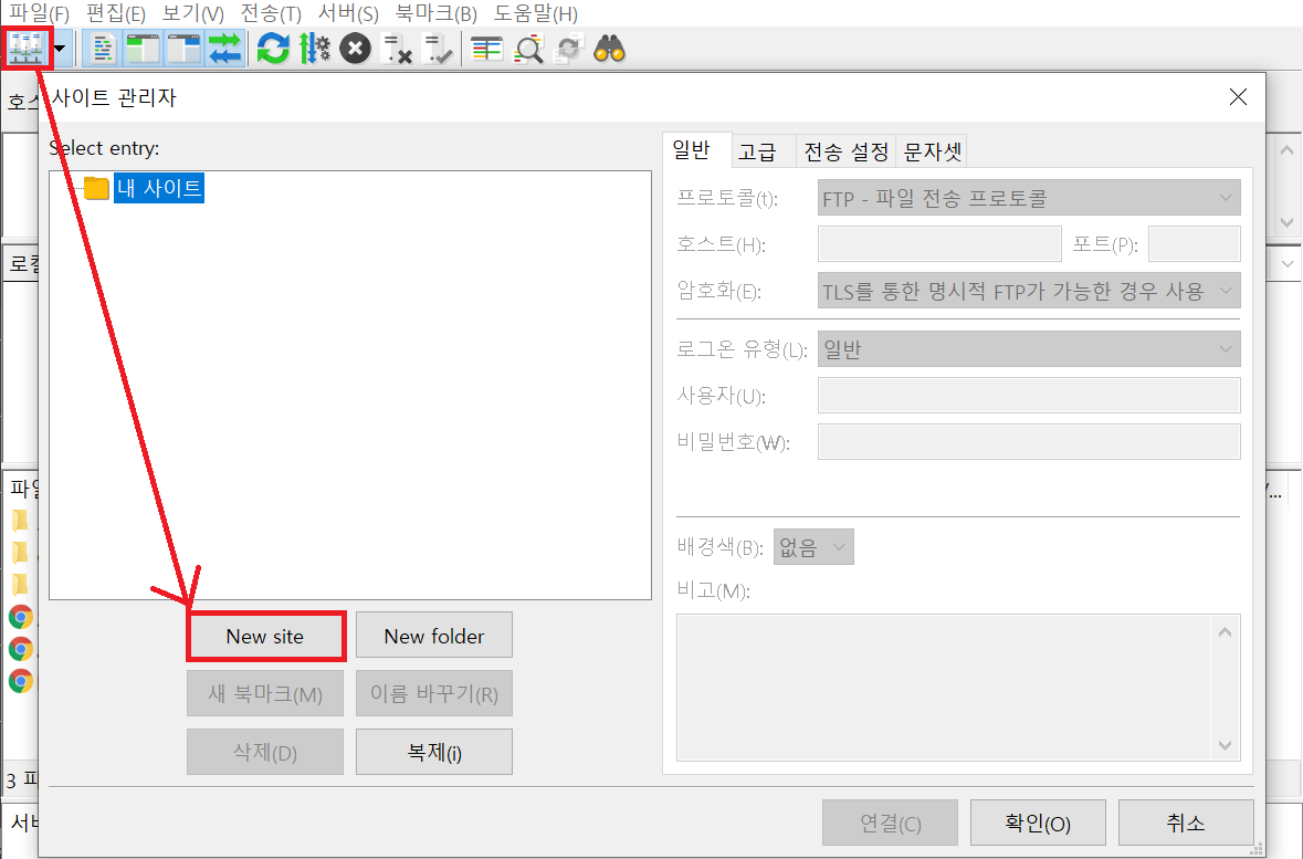 new site를 클릭 -> 오른쪽에 호스트, 포트, 사용자, 비밀번호를 입력