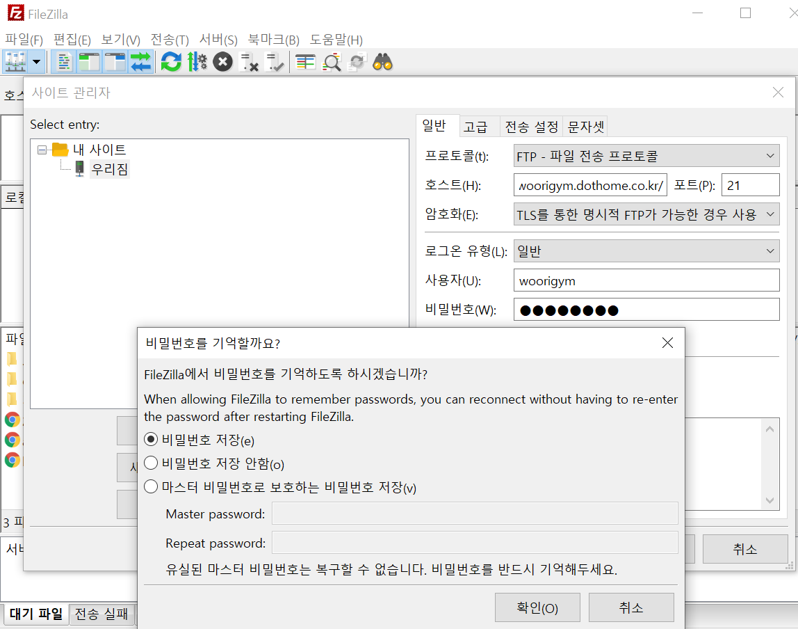 실행하면 이 창이 뜨는데, 맨 위에는 닷홈에서 받은 호스팅 정보를 적으면 된다.