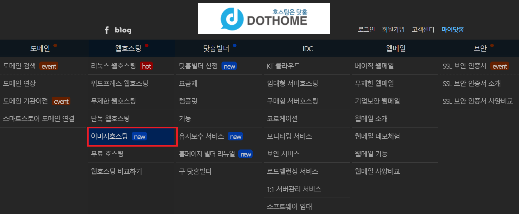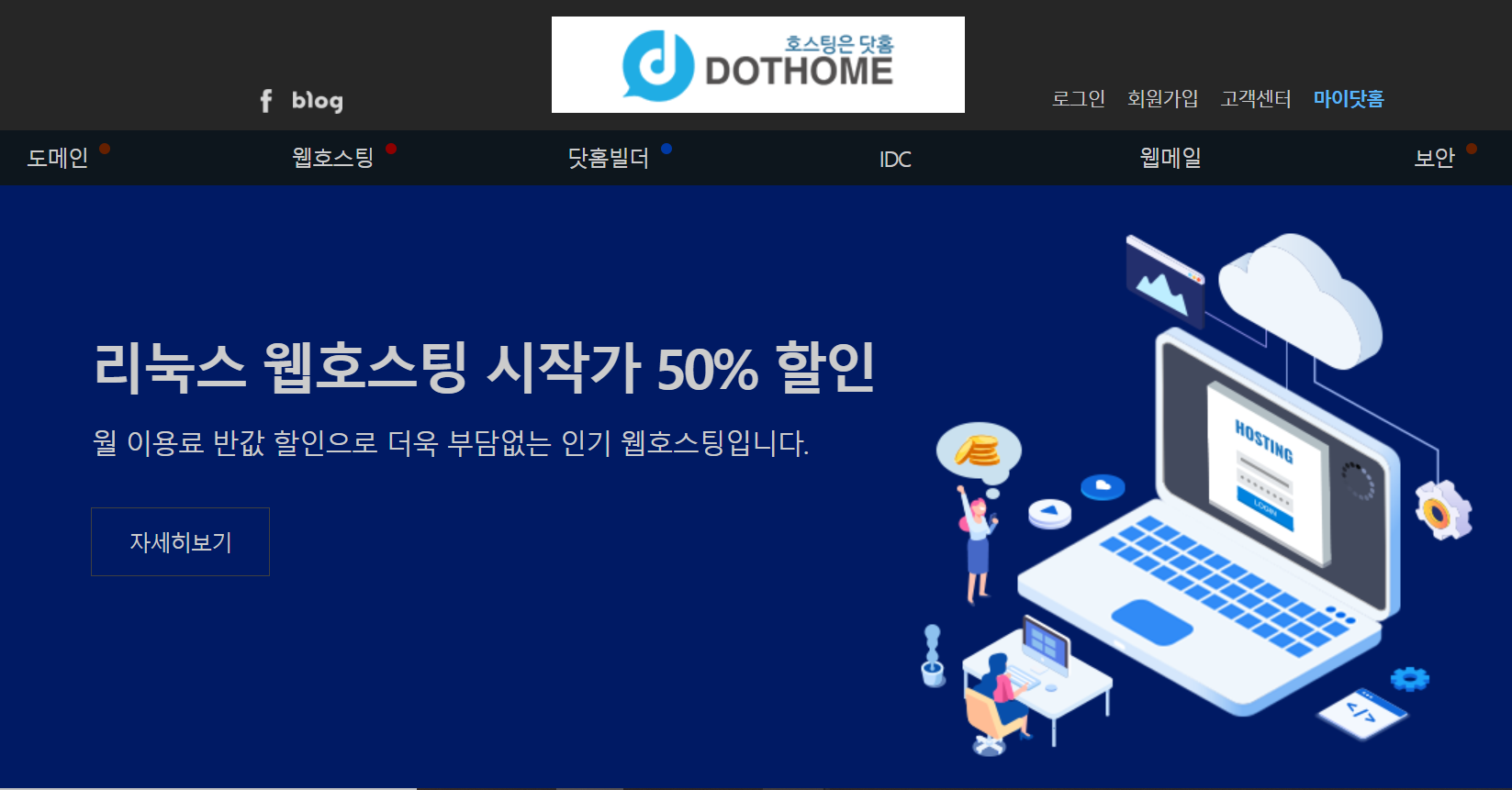 닷홈은 도메인, 무료 웹호스팅, 웹빌더, 메일호스팅, SSL보안인증서, 서버호스팅, 코로케이션 등 다양한 호스팅 서비스를 제공하고 있습니다.