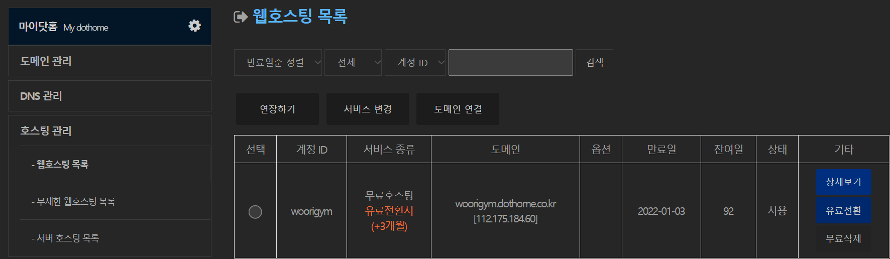 마이닷홈 -> 호스팅 관리 -> 웹호스팅 목록을 클릭하면 확인 가능하다