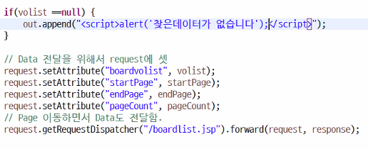 서블릿에서는 Printwriter out 쓰지말고, view로 넘겨서 확인해라(request.getRequestDispatcher("/boadlist.jsp")