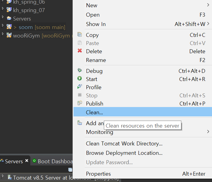 3. Servers - Tomcat 우클릭 - Clean