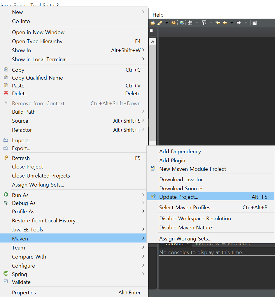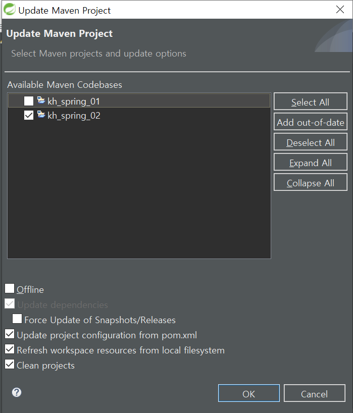 1. 프로젝트 우클릭 - Maven - update Project - Force update 체크