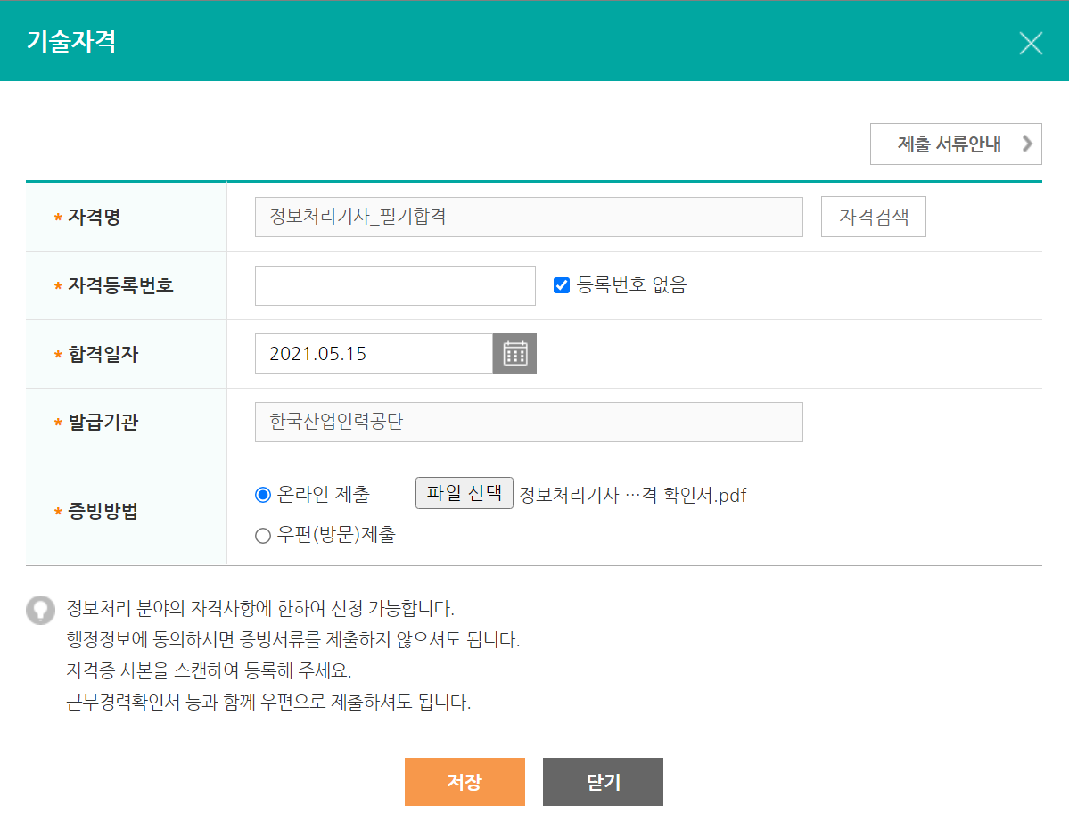 기술자격 추가 클릭시 아래와 같은 창이 뜹니다