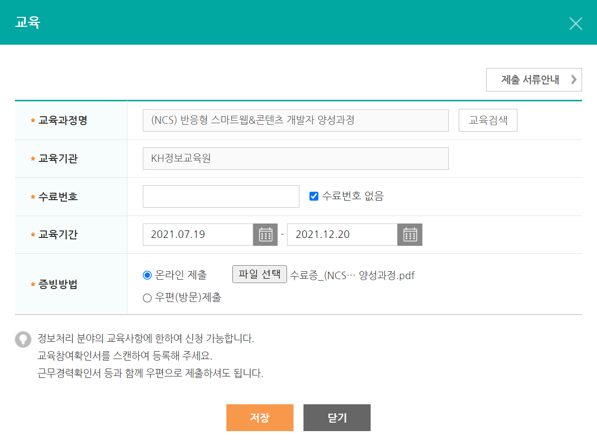 교육 추가 클릭시 아래와 같은 창이 뜹니다