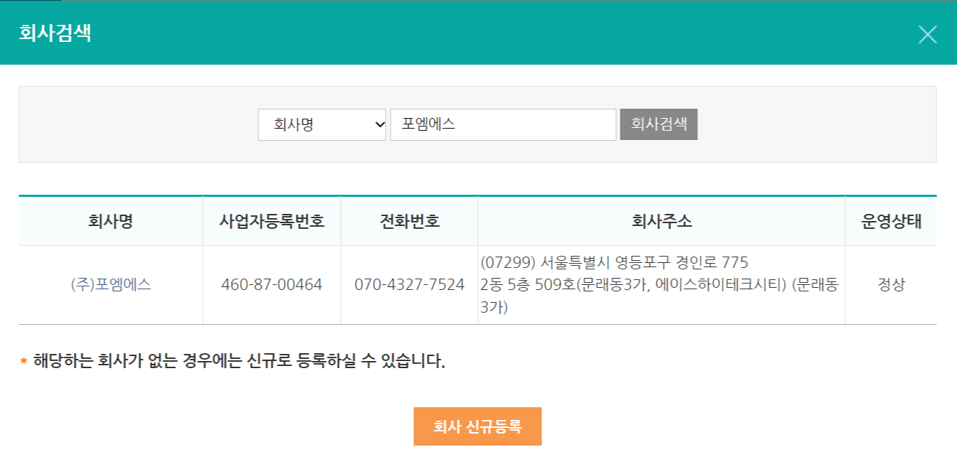 회사명, 업종, 사업자번호, 전화번호, 주소가 자동으로 입력됩니다.