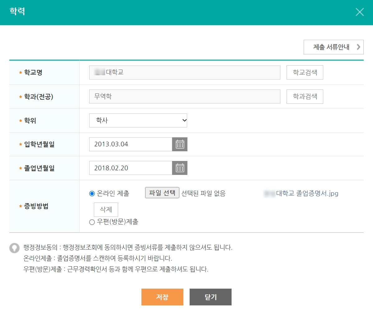 학력 추가 클릭시 아래와 같은 창이 뜹니다
