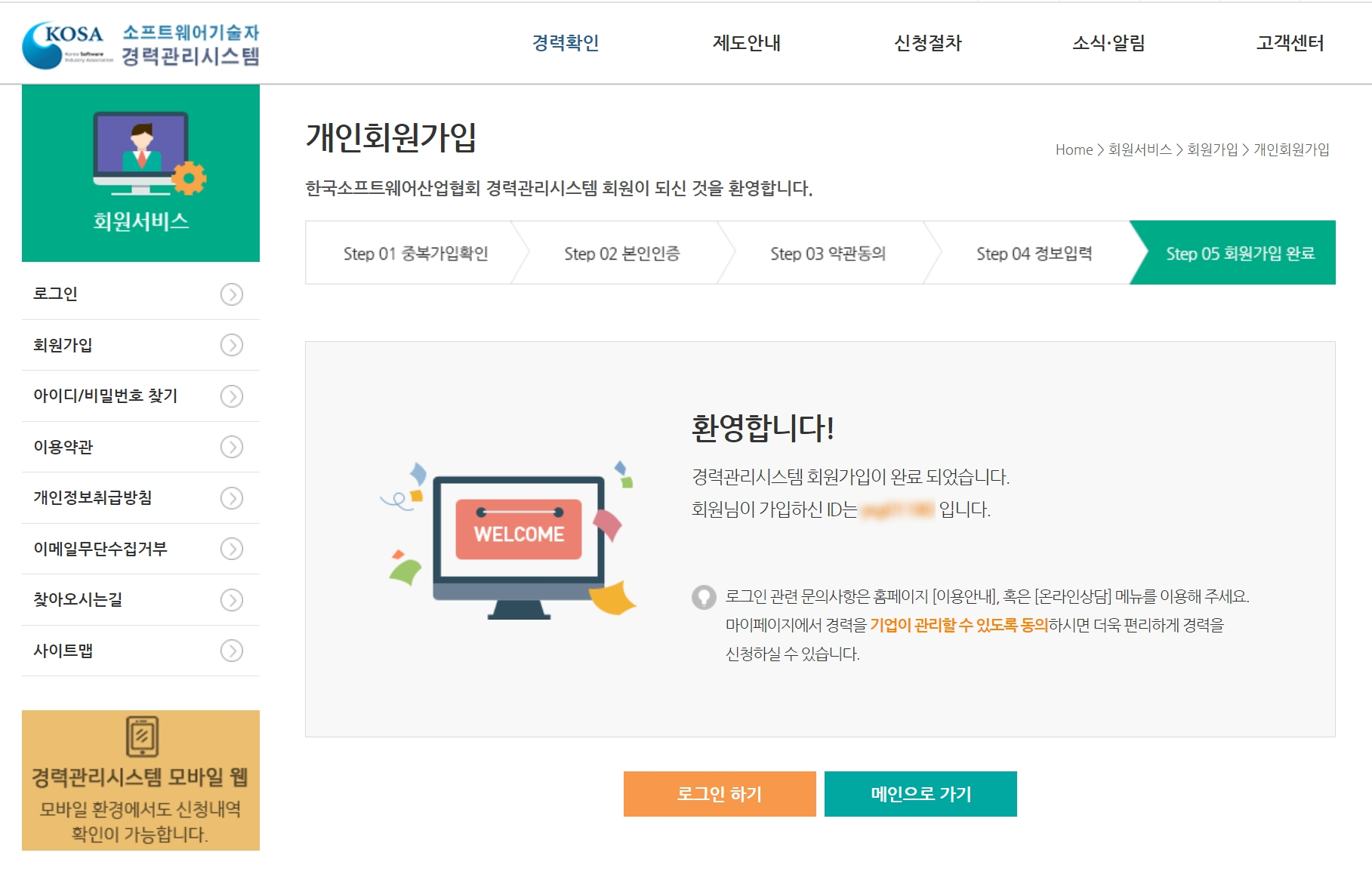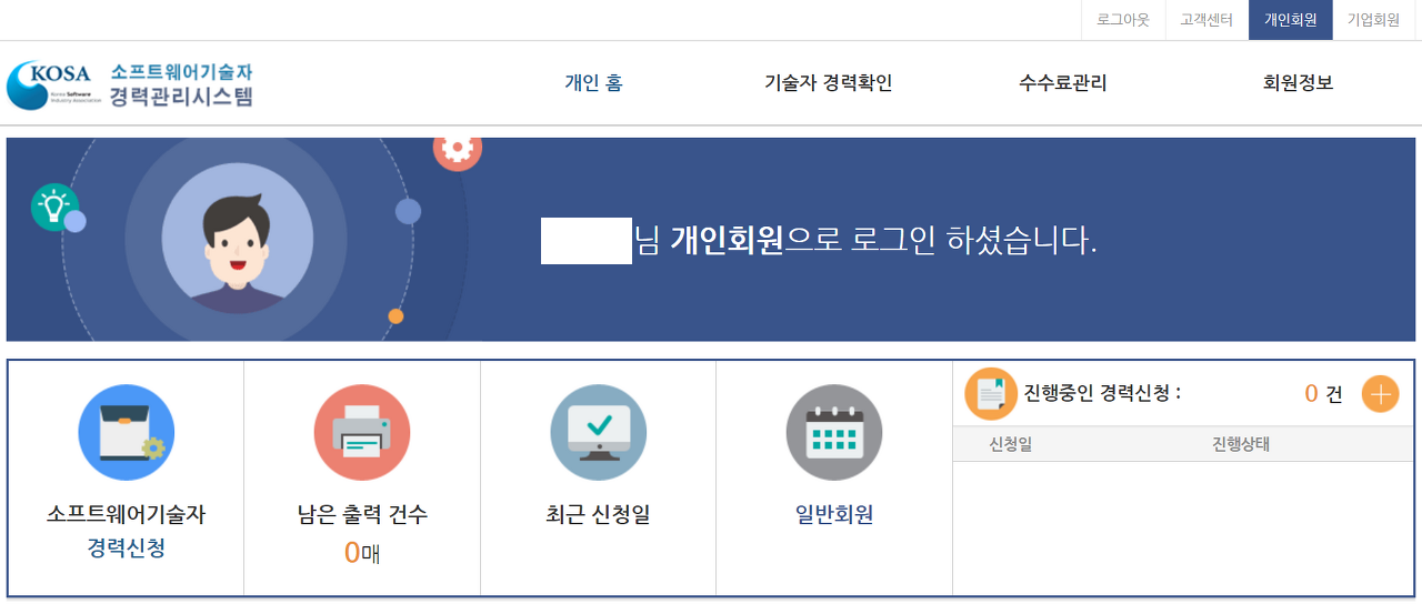 소프트웨어기술자 경력관리 시스템(KOSA) 가입했습니다