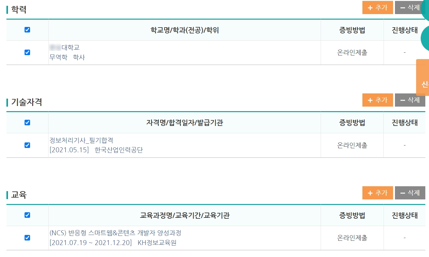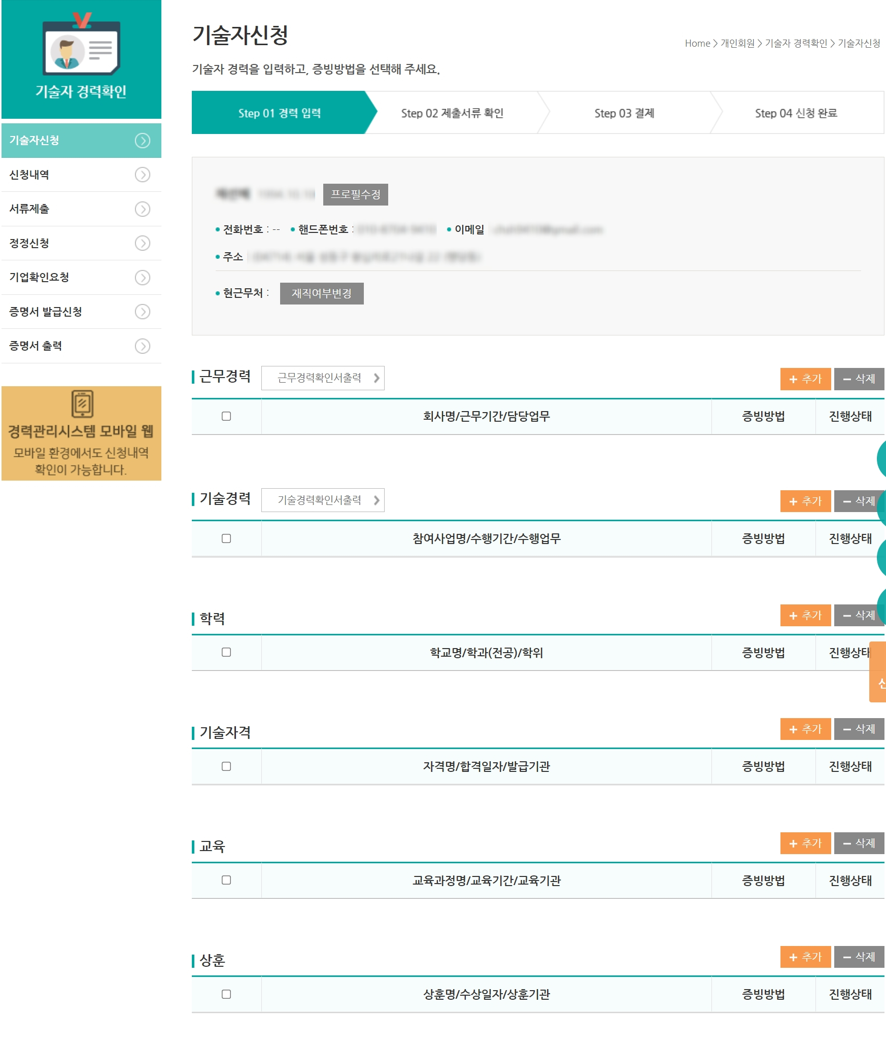 근무경력(정규직) / 기술경력(계약직, 프리랜서) / 학력 / 기술자격 / 교육 / 상훈(정보분야만)을 추가할 수 있습니다.