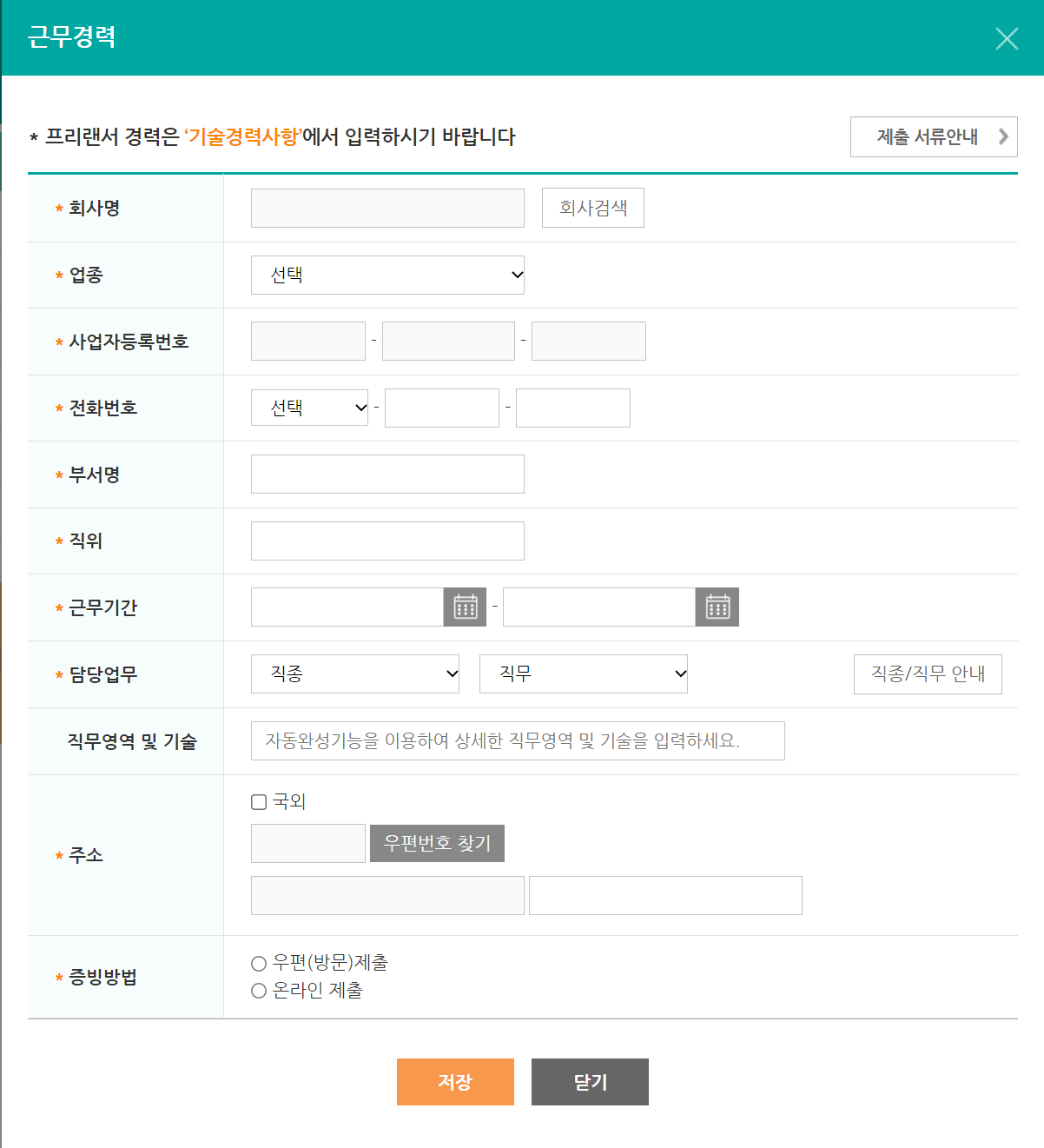 근무경력 추가 클릭시 아래와 같은 창이 뜹니다