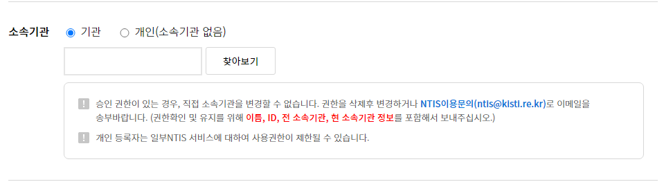 저는 연구원이라 소속기관을 "찾아보기"에서 검색해서 클릭했습니다