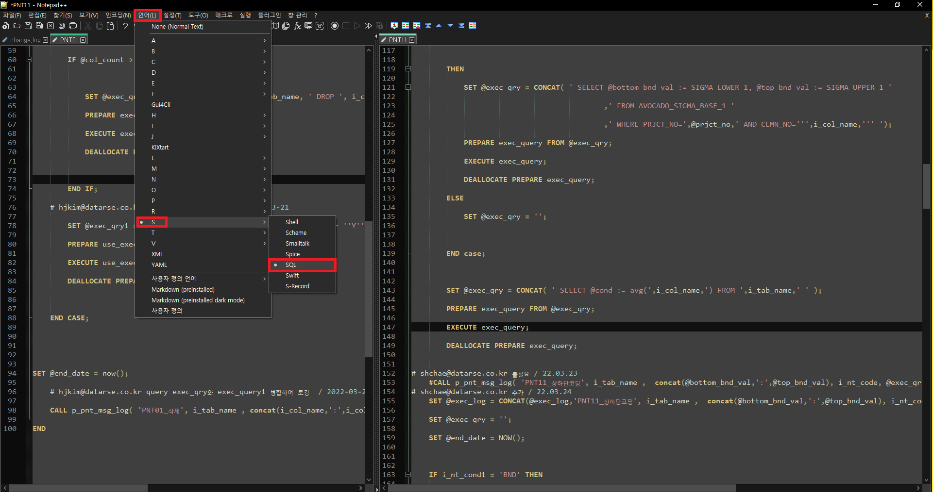 저는 SQL문을 가독성 좋게 보기 위해 언어 설정을 했습니다.