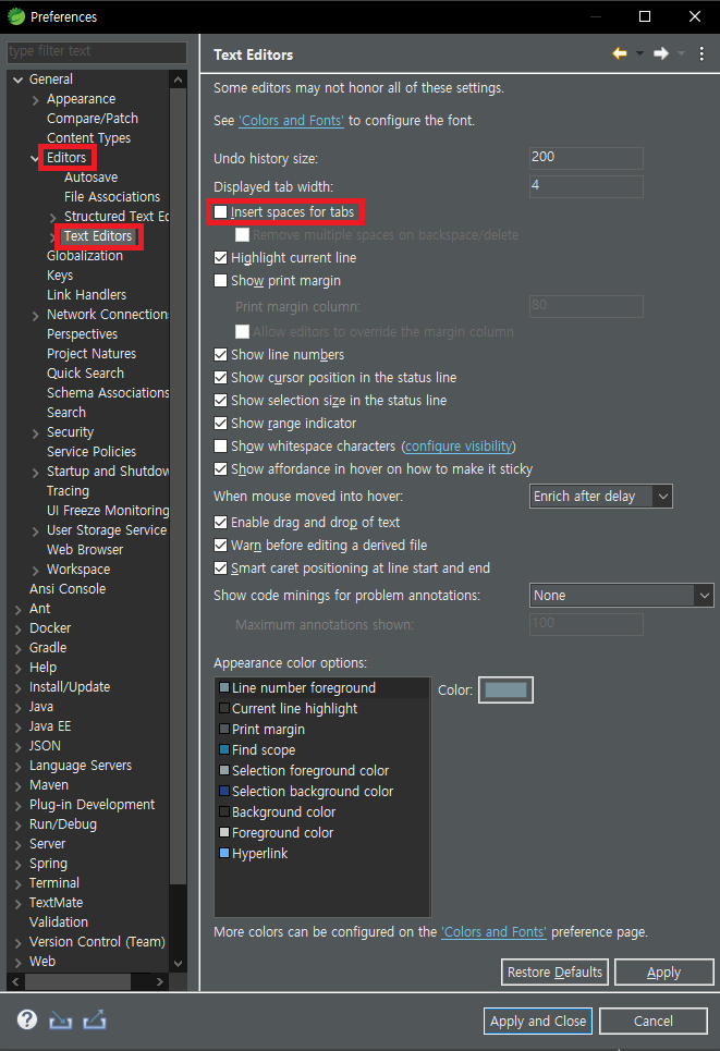 Editors -> Text Editors -> Insert spaces for tabs 체크 -> Apply