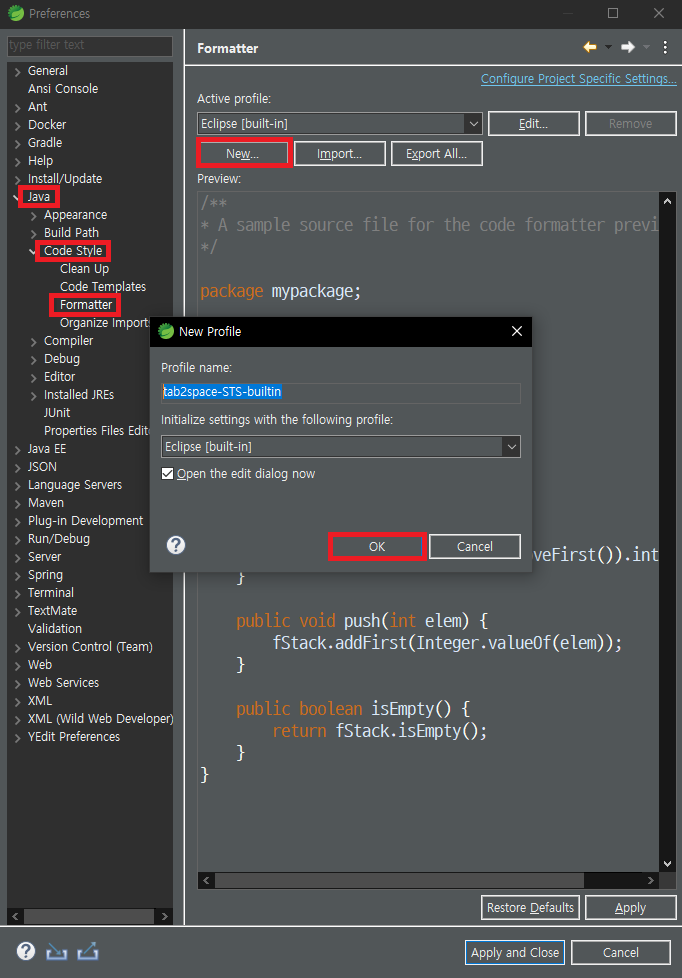 Apply and Close를 클릭해 Preferences를 닫아줍니다
