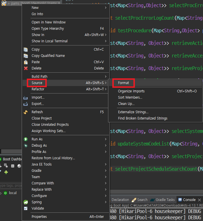 또는 전체프로젝트 우클릭 -> Source -> Format 클릭하면 됩니다