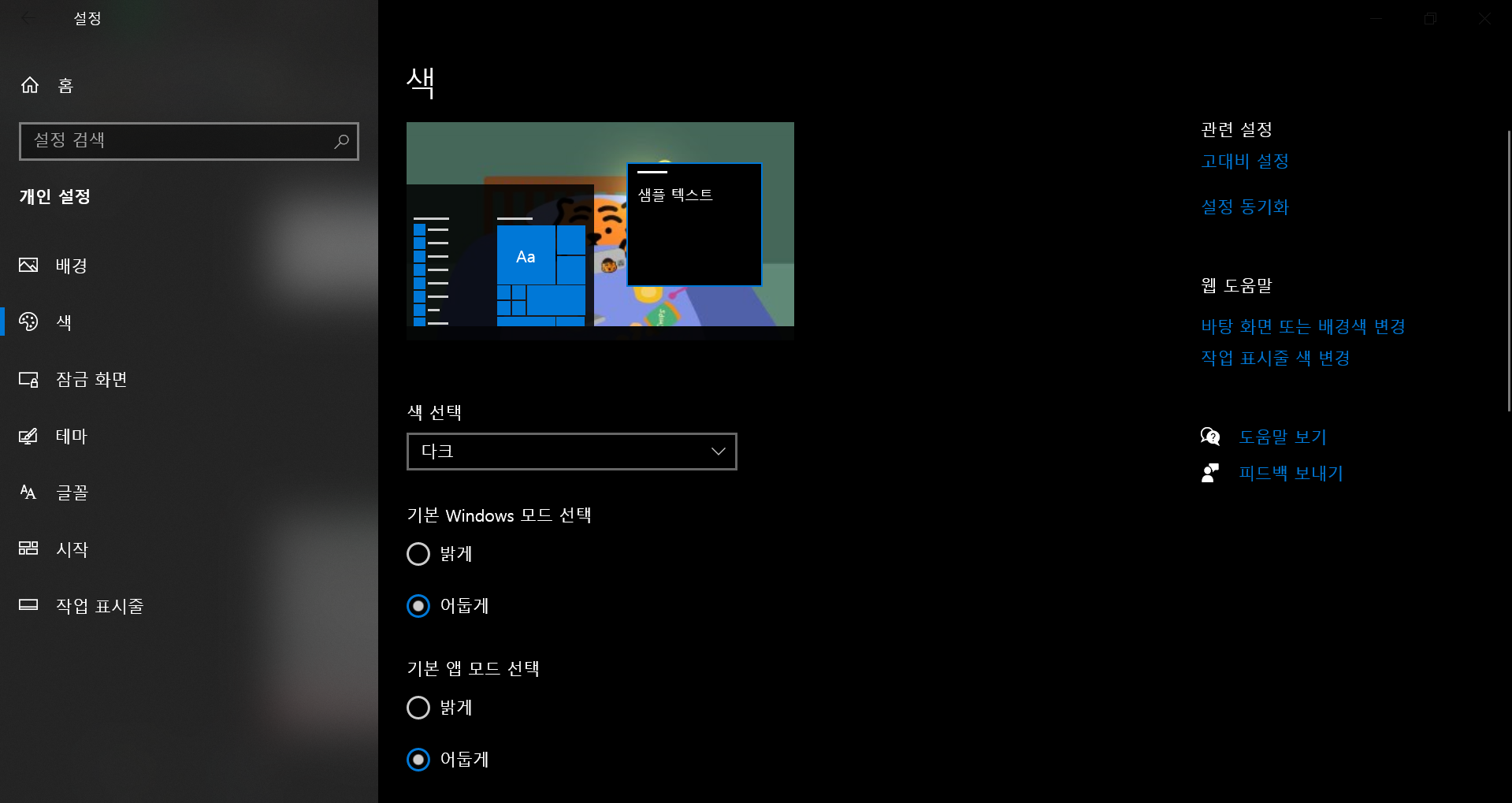 색 - 사용자 지정 - 기본 앱 모드 선택 - 어둡게