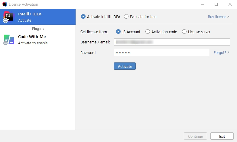 아까 가입한 Jetbrains 계정 입력 -> Activate