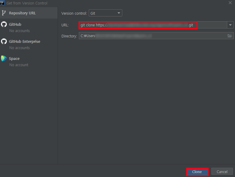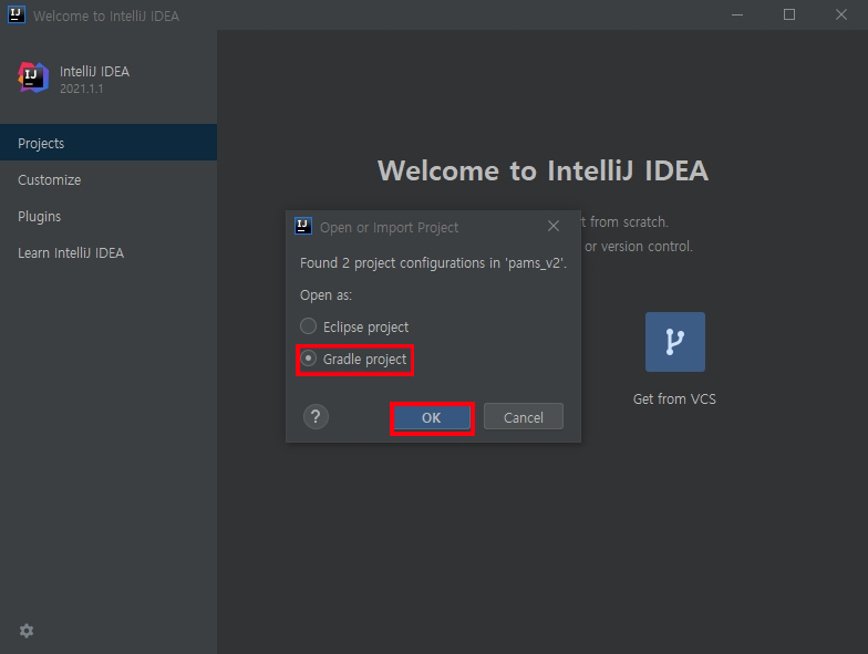 인텔리제이를 설치하고 처음 프로젝트는 VCS(git 등)로 소스코드를 열어야