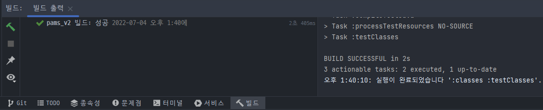 하단의 빌드 클릭 시 빌드 성공여부를 볼 수 있습니다