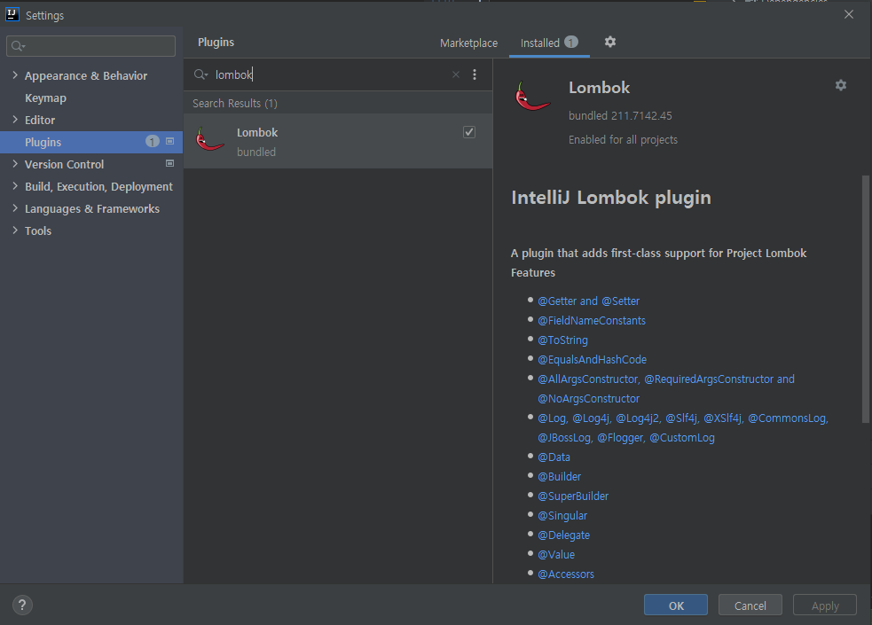 File -> Settings (Ctrl+Alt+S) -> Pugins -> 검색창에 "lombok" 입력 - Install