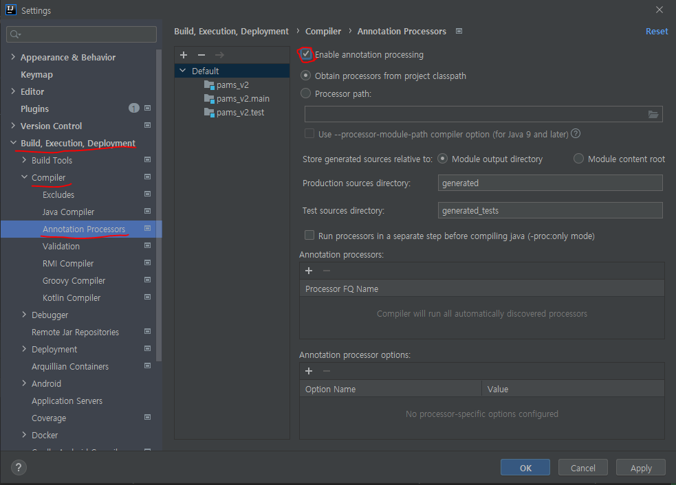 Compiler - Annotation Processors - Enable Annotation Processing 체크 - OK