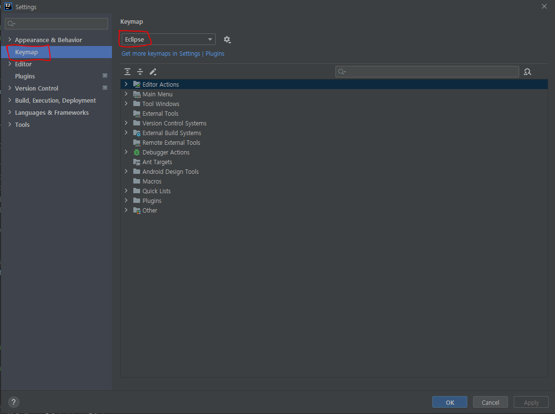 설정(Ctrl+Alt+S) - Keymap - Eclipse - OK