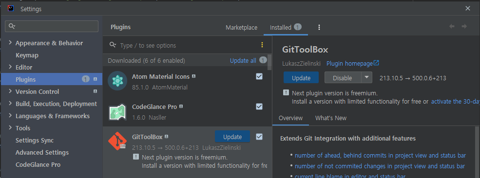 주의: GitToolBox 업데이트 시 유료버전으로 바뀌므로 결제해야 사용가능하다. update 금지